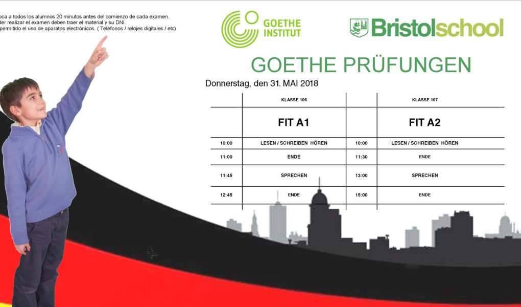 A continuación os dejamos los horarios en los que se van a realizar los exámenes oficiales de Alemán el próximo jueves 31 de mayo 2018. Es muy importante que traigan ese día un documento oficial (DNI o Pasaporte)   ¡¡ Muchas suerte chicos !!